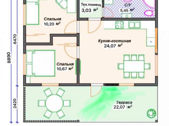 Каркасный дом 8х9+терасса 2х10,5, высота 1 этажа 2,8 м., второй этаж чердак/мансарда в коньке 2,5 м. (Можно сделать полноценную жилую мансарду 30 кв. м.), По документам площадь с террасой 88 кв. м., внутри дома 67 м. кв. Если считать чердак с высотой в коньке 2,5 м. + 30 м. кв. Итого 118 м. кв.