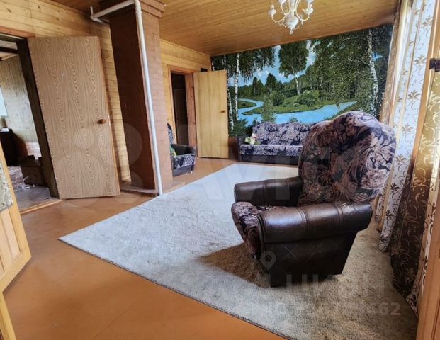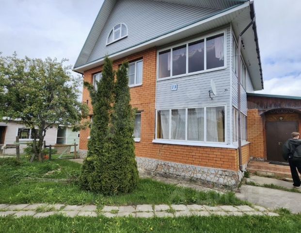 БОЛЬШОЙ ДОМ (1998-2000 года постройки) из бруса, обшит сайдингом. На 1-м этаже расположена кухня, санузел с ванной (установлен электрический бойлер), спальня и гостиная с камином, в прихожей печь для отапливания дровами. 2-й этаж: 3 комнаты, санузел с душевой кабиной, балкон.