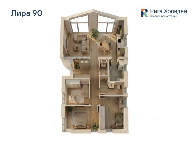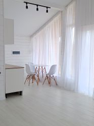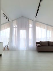 Внутри прихожая, кухня-гостиная 29 м2 с высокими окнами " в пол" и потолками до 5 м высотой, спальня 12 м2, из которой вход в совмещенный с/у с ванной. Отдельная детская/гостевая/кабинет 13 м2, общий с/у с умывальником . котельная.