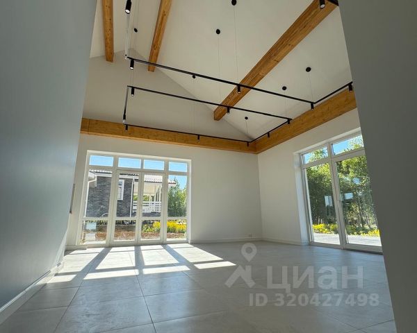 1 эт. крытое крыльцо, светлая просторная гостиная со вторым светом (потолки 7 м), большая кухня с барной стойкой из натурального дерева, столовая с выходом на крытую террасу 30м2, спальня, с/у с душевой кабиной, котельная, кладовая