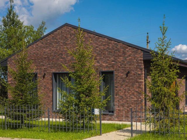 Каменный шпон фасада и лиственничная кровля придают дому оригинальный стиль. Внутри — светлые, просторные пространства в стиле скандинавского минимализма: много стекла, деревянный шпон и декоративный бетон. Потолки, выполненные из лиственницы, словно продолжают природную эстетику дома.