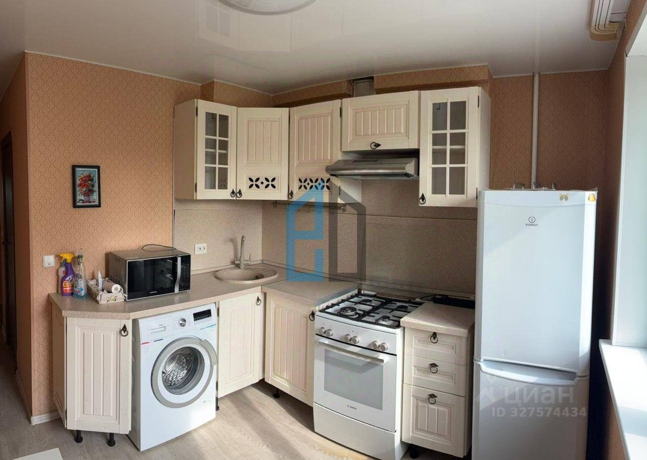 Кухня: Кухонный гарнитур, плита, холодильник, стиральная машина и микроволновая печь.