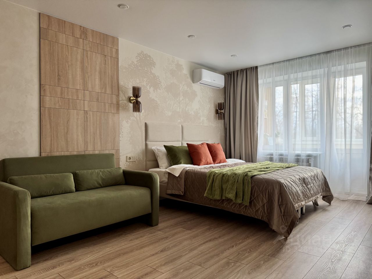 В квартире с комфортом могут проживать до четырех человек (двуспальный диван и модульная кровать гостиничного типа, трансформируемая в две односпальные).