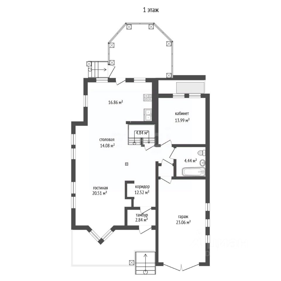 гостиная, объединённая с кухней и выходом в зимний сад, формирует просторное общесемейное пространство для отдыха и приёма гостей, рядом расположен отдельный кабинет для работы и учёбы, а тёплый гараж с автоматическими воротами обеспечивает прямой и сухой доступ в дом в любую погоду. Наличие санузла на уровне гостевой зоны делает повседневное использование этажа максимально удобным.