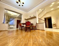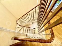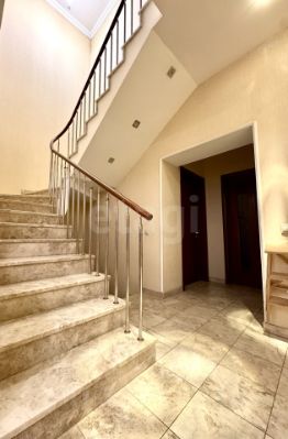 Парадный вход акцентирован крытой террасой с балюстрадой, которая служит и функциональной зоной отдыха, и архитектурным украшением дома. Интегрированный гараж и удобная планировка участка с возможностью парковки нескольких автомобилей обеспечивают высокий уровень комфорта для постоянного проживания.