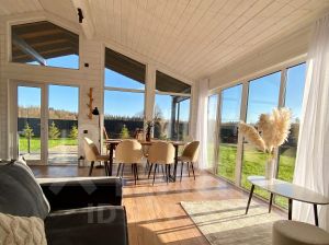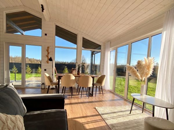 Простор и диалог с водой в гостевом доме улучшенной планировки Дом Этюд — это улучшенной планировкой для тех, кто ищет не просто уединение, а вдохновляющий простор. Вид на Истринское водохранилище становится главным элементом интерьера, который Вы будете наблюдать из каждой точки — от кухни с барной стойкой до просторной террасы. За мягкое регулирование света и уединение отвечают деревянные жалюзи, которые гармонично дополняют эко-стиль виллы. Усовершенствованная планировка включает: Зона отдыха: комфортабельная кровать King-size с высоким ортопедическим матрацем премиум класса или с двумя раздельными кроватями с возможностью совмещения в King-size. Гостиная: уютная зона с диваном и современной ТВ-панелью и панорамными окнами от пола до потолка открывают живую картину воды и неба. Кухня-гостиная: стильная кухня с барной стойкой, оснащенная всей необходимой техникой и посудой для кулинарных экспериментов и чайной станцией с чаем, кофе, сахаром, а также винным шкафом. Дополнительные преимущества: просторный санузел с окном и вместительная система хранения для ваших вещей. Продуманное зонирование создает ощущение настоящего дома, а не временного жилья. Философия натуральности и эстетики: Как и во всех наших гостевых домах и виллах, здесь использованы только натуральные и экологичные материалы, включая деревянные жалюзи. Интерьер дополнен дизайнерской мебелью, текстилем из чистого хлопка и авторской косметикой. Продуманные сценарии освещения и система умного климата с теплыми полами создают неповторимую атмосферу заботы и релакса. Здесь Вы почувствуете, как легкость пути из города превращается в полноценность жизни у воды, где сервис как предчувствие обеспечивает безупречный комфорт.